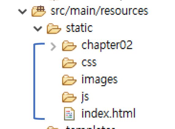 우리는 웹 페이지를 HTML 대신 JSP로 만들것이므로 static 폴더 안에는 JS, CSS, 이미지 파일, 동영상 파일만 올 수 있다고 여기면 됨