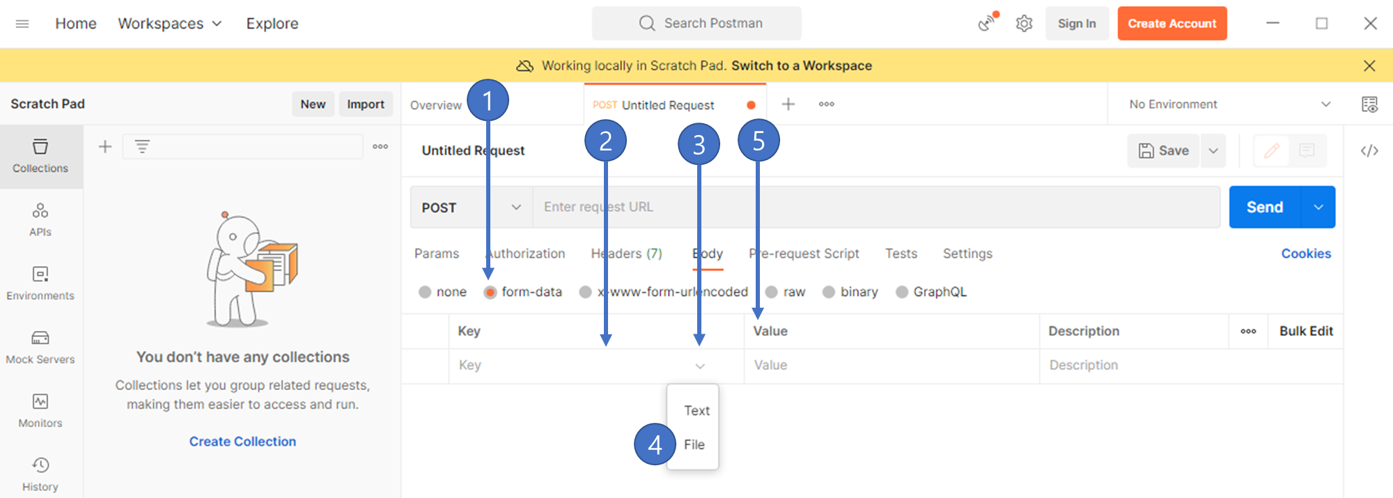 파일을 보내고 싶다면 [ form-data ] (1) 를 선택하고 이름(2)에 마우스를 올려두면 [ 선택 버튼 ] (3)이 나오는데 이때 [ File ] (4) 을 선택하고 값(5)에 보내고 싶은 파일을 선택하면 됨