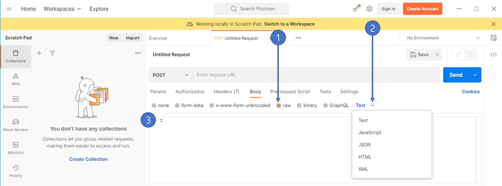 만약 JSON을 보내고 싶을 때는 [ raw ] (1) 를 선택하고 보낼 데이터 유형 (1) 을 JSON으로 선택한 다음 JSON 데이터를 입력 (3) 하고 보내면 됨