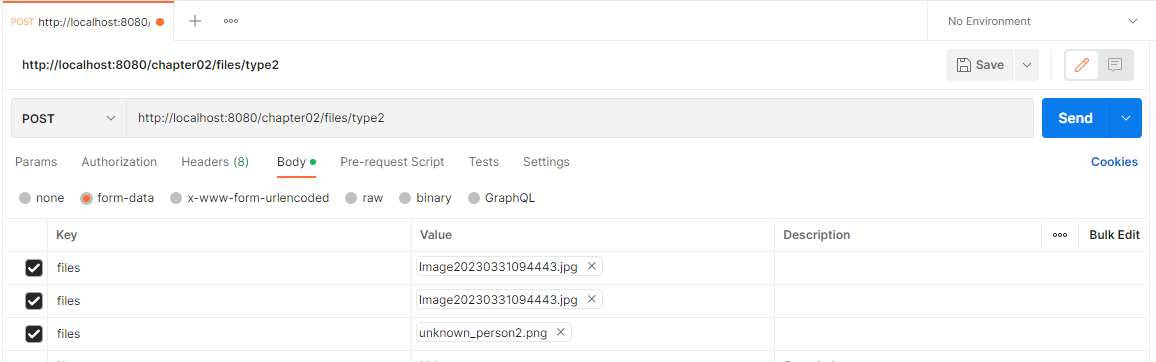 Postman 으로 테스트 할 때는 아래와 같이 파일들 files 이름에 담아서 보내면 됨