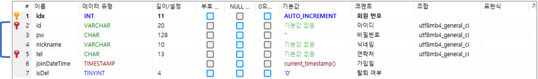 member 테이블을 보면 회원 가입을 하려면 클라이언트는 id, pw, nickname, tel 값을 보내야함