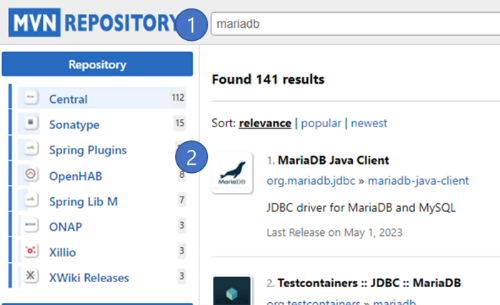 maven repository 에서 mariadb 로 검색(1) 후 MariaDB Java Client 라이브러리 페이지(2)로 들어가자