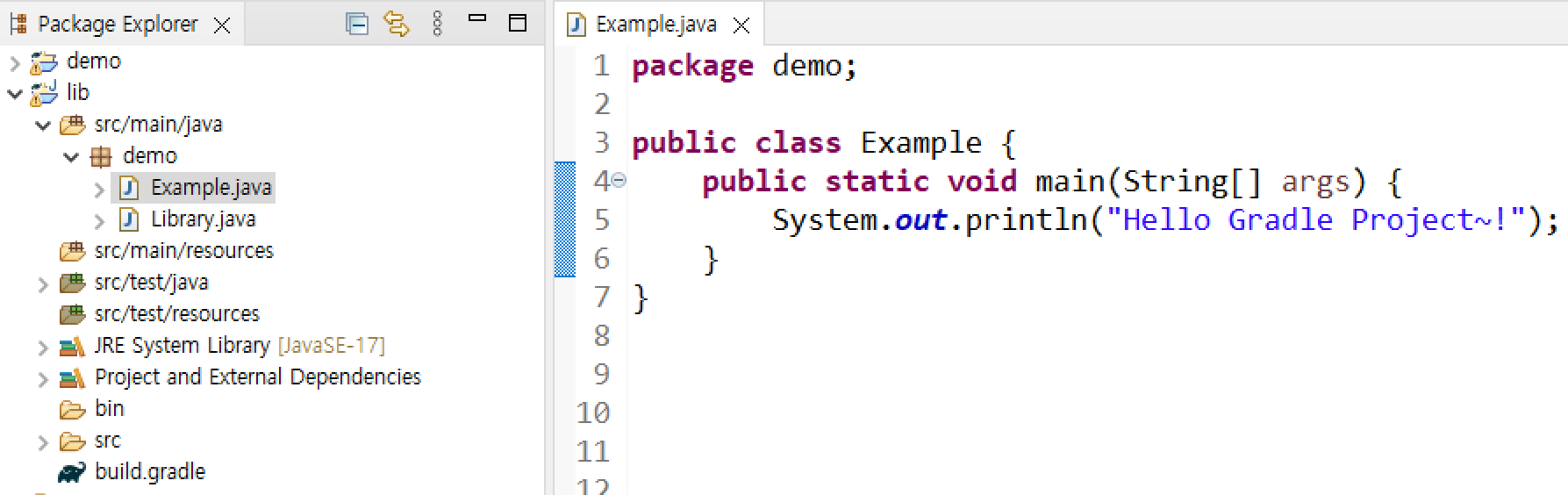 lib 프로젝트 > src/main/java > 패키지 안에 아래와 같이 샘플 코드를 추가해 실행시켜보자
