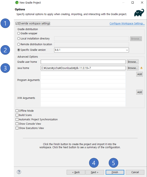 Gradle 설정 화면에서 다음과 같이 [ Override workspace settings ] (1) 를 클릭해 지금 만들 프로젝트의 Gradle 버전을 바꾸자