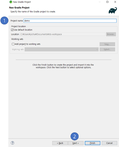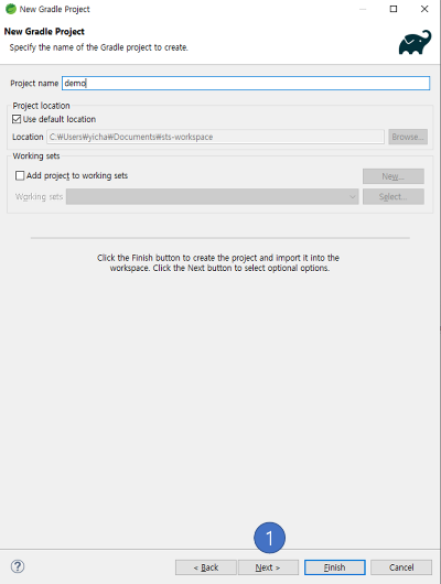 프로젝트명은 전과 마찬가지로 demo 로 하고 [ Next ] (1) 클릭