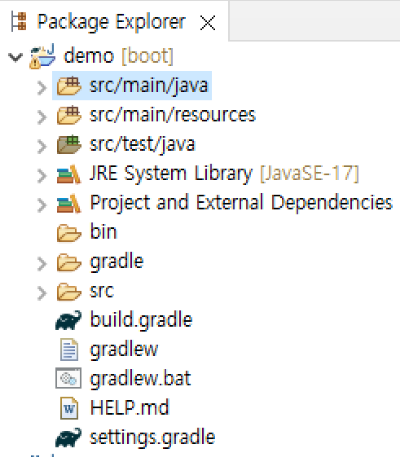 그리고 어느 IDE든 Spring Boot 로 Gradle을 사용하는 SpringFramework 프로젝트를 생성하면 다음과 같이 생성됨