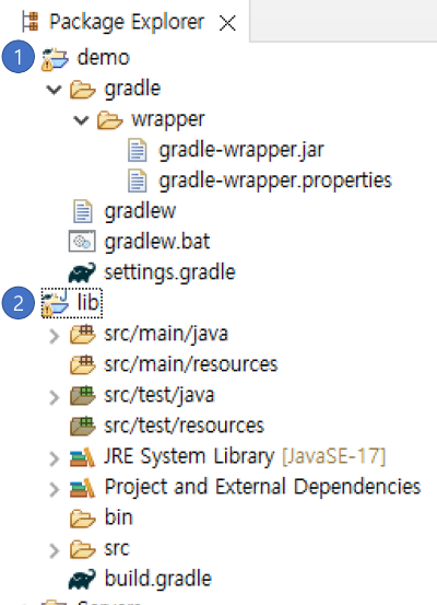 Gradle 6.6.1 이후 버전부터는 자바 프로젝트를 만들면 [ 프로젝트명 ] 으로 프로젝트가 만들어지고(1) 이 프로젝트와 연결된 lib 프로젝트가 하나 더 만들어짐(2)