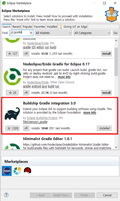 개발툴 내 > [ Help ] > Eclipse Marketplace ] > gradle 검색 > Buildship Gradle Integeration 3.0 이 설치 되어있는지 확인하자