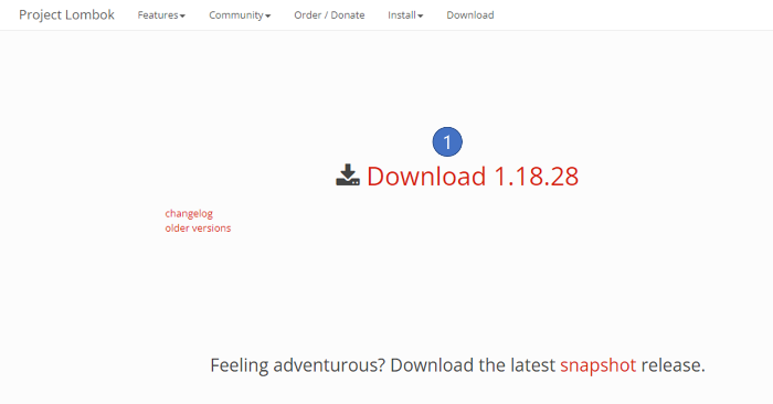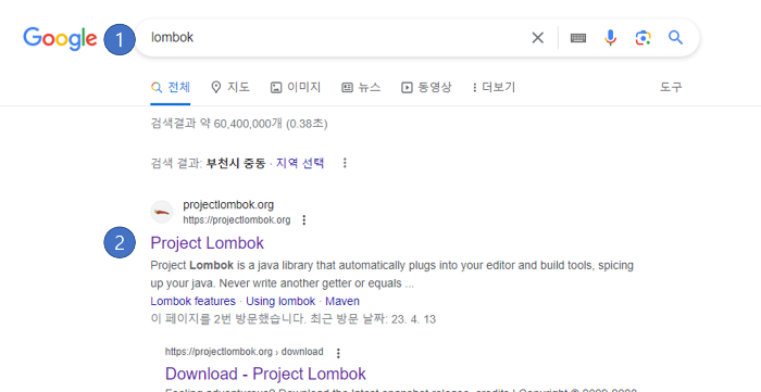 롬복을 설치하기 위해 검색엔진에서 lombok 검색 (1) -> 첫 번째 검색 결과 (2) 로 이동