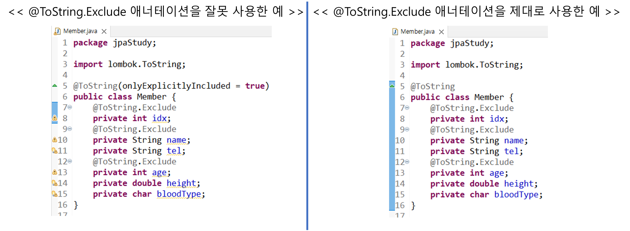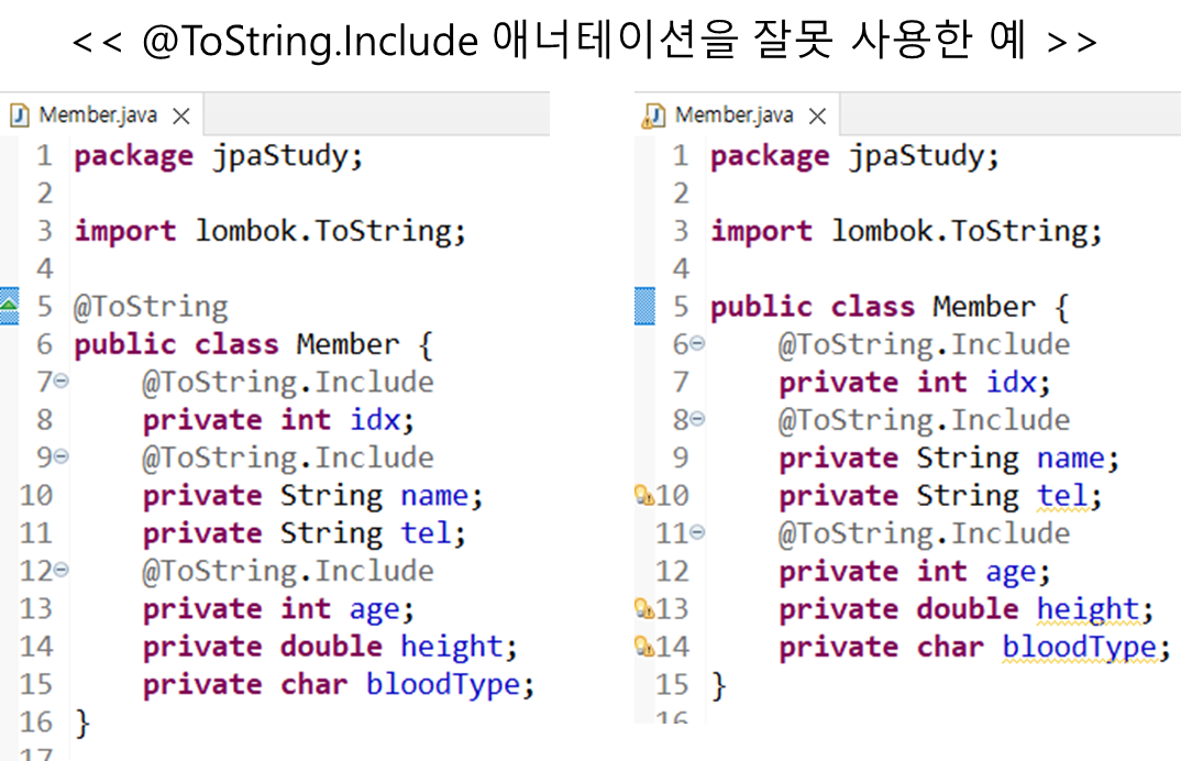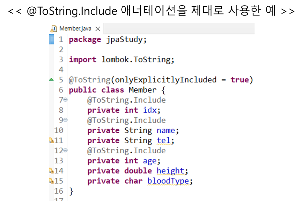 멤버 변수 마다 @ToString 애너테이션을 사용할 때는 아래와 같이 사용함
