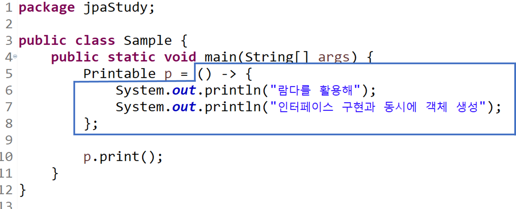 그래서 번거롭게 Printable 인터페이스를 구현한 Printer 클래스를 선언하고 그러면서 Printer 클래스 안에 print 메서드를 정의하고 또~ Printer 클래스의 인스턴스를 생성한 후 printerPerson 메서드를 호출하는 과정이 아니라 간단하게 람다식을 사용해서 printerPerson 메서드를 호출하면서 print 메서드를 구현해 print 메서드를 매개변수로 전달하는 것