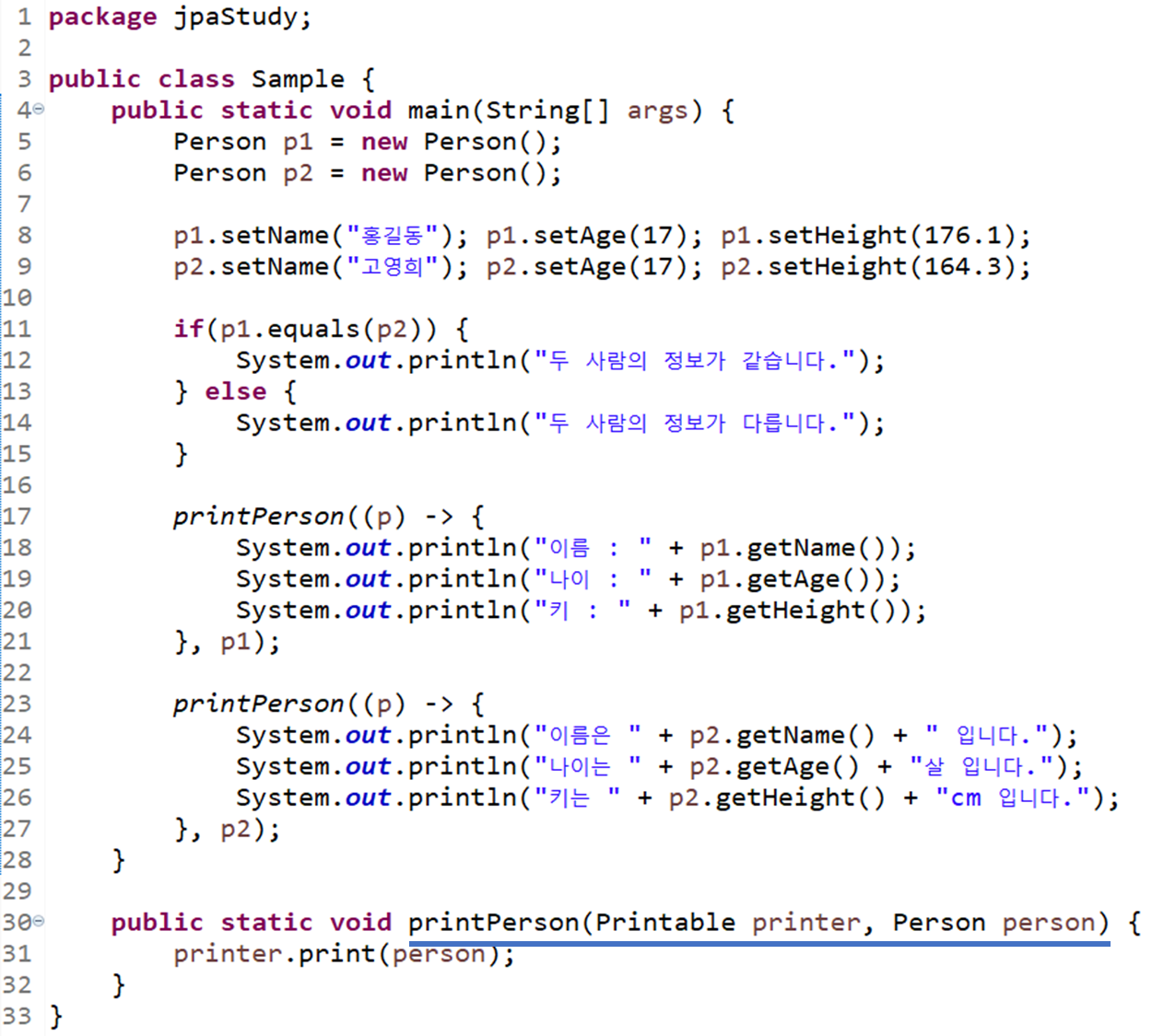 아래 설명을 보기 전 먼저 여러분이 직접 코드를 충분히 천천히 살펴보면서 printPerson 메서드를 이해하길 바람