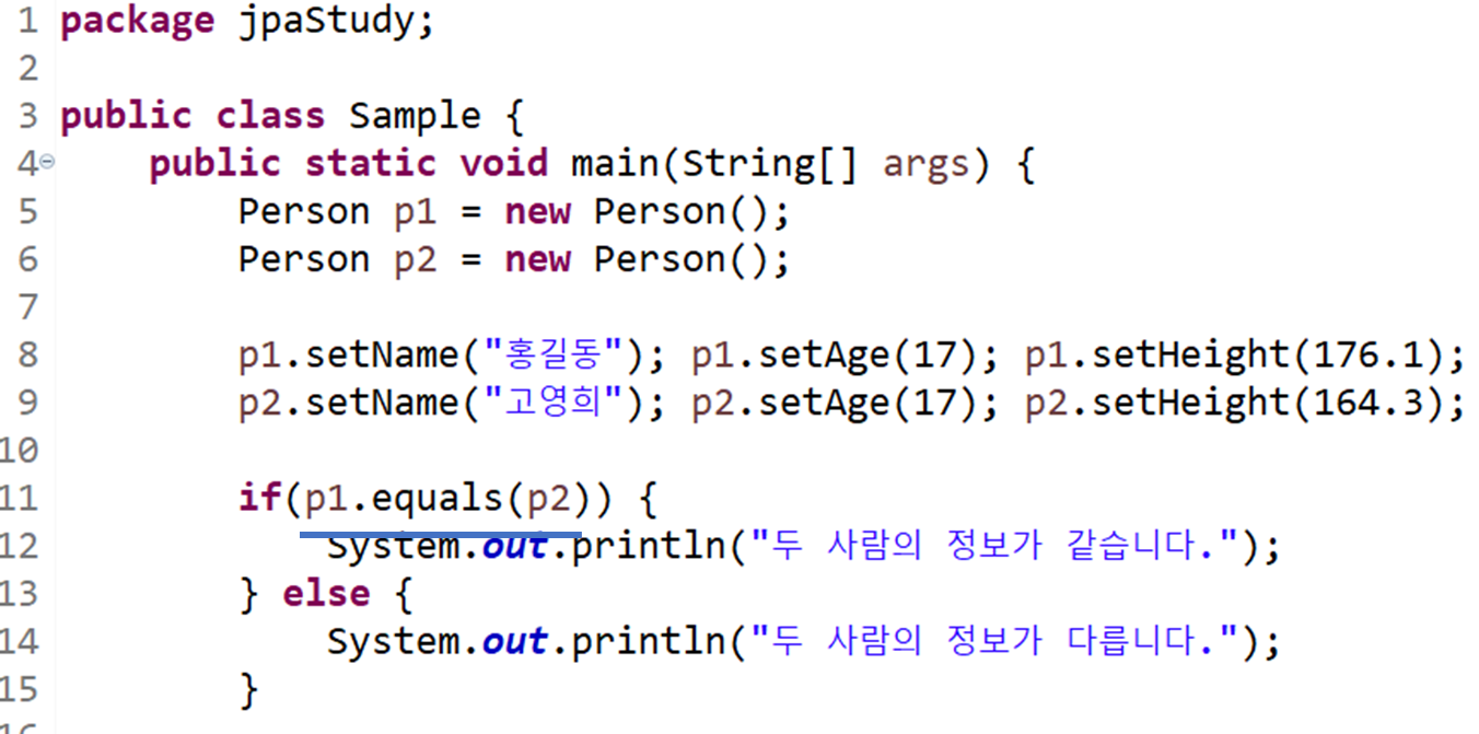 그래서 equals 메서드를 호출 하면서 인자로 객체를 넣었음