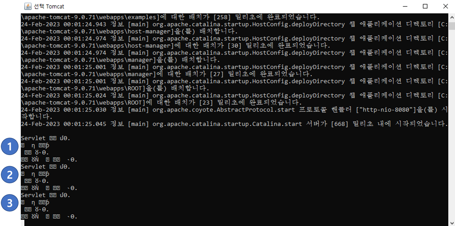 해당 주소로 여러번 접근해보면 그럴 때 마다 서블릿이 호출되므로 cmd 창에 문장이 출력된다는 걸 알 수 있음