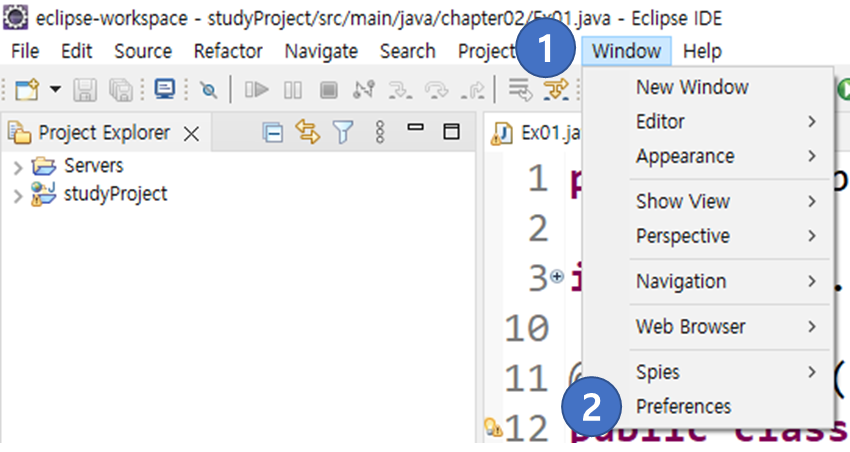 이클립스 workspace 경로는 [ 이클립스 내 Window ] (1) -> [ Preferences ] (2)