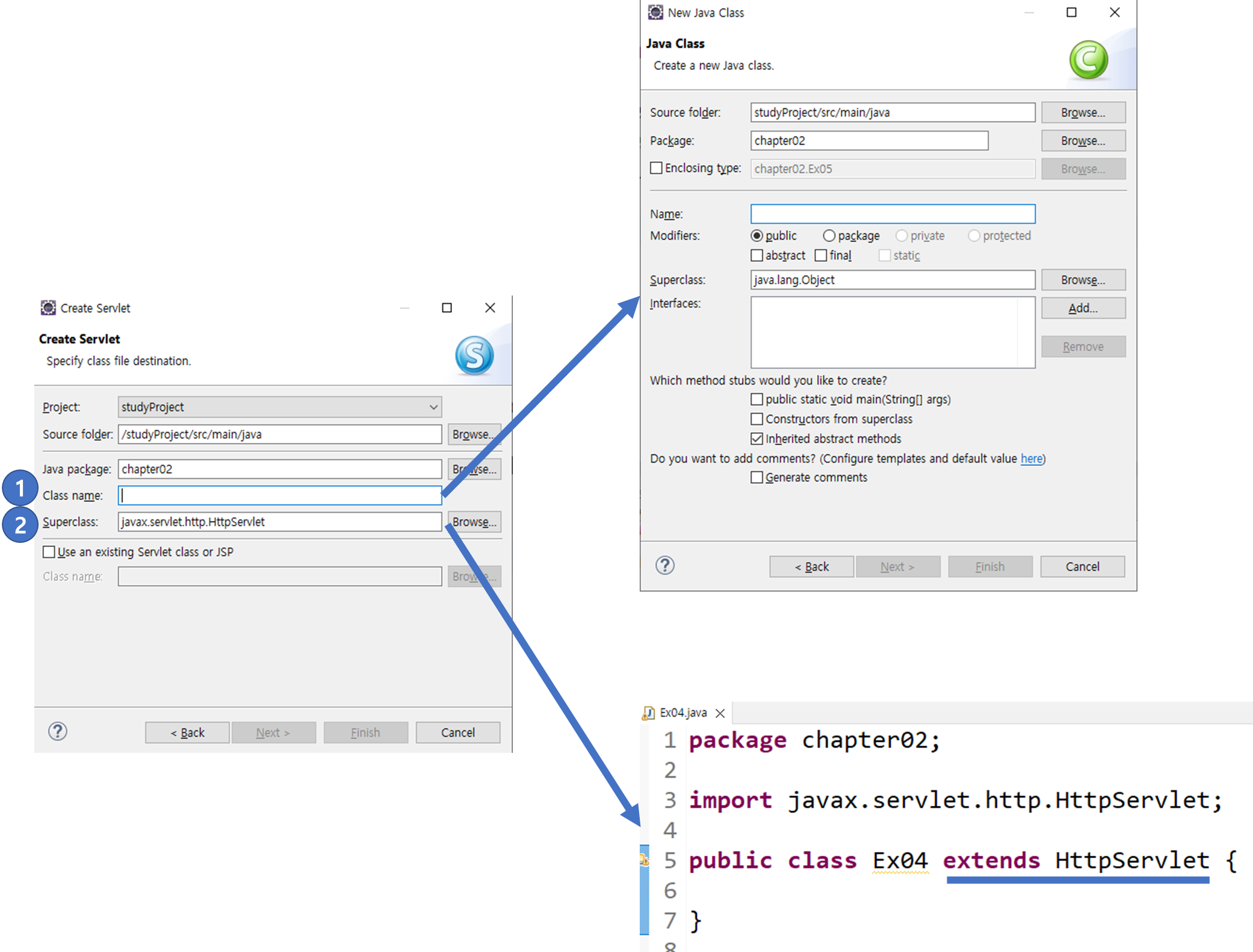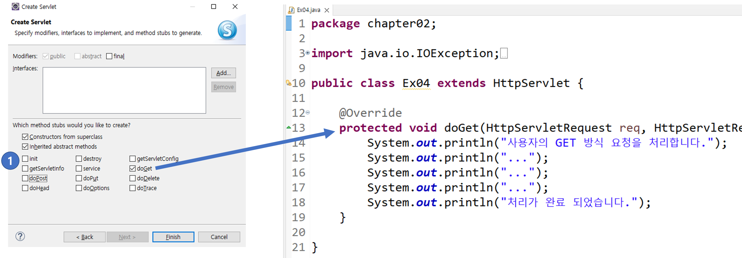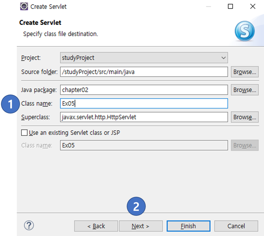 | (1) 입력하는 클래스명이 앞에서 클래스를 만드는 과정 (2) Superclass 부분이 클래스를 만들고 extends HttpServlet 을 했던 과정 이 두 과정이 한 단계로 압축된 것 |