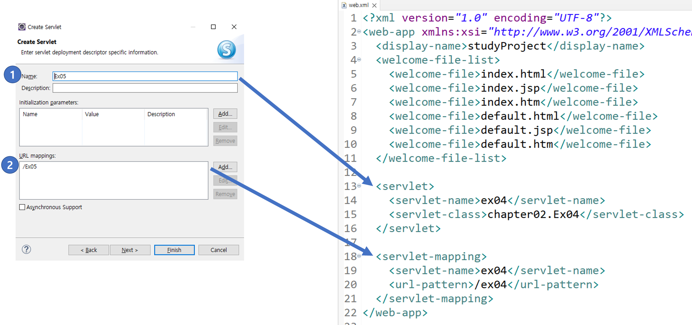 URL mappings 에 /Ex05 로 되어있으므로 클라이언트가 이 서블릿에 접근할 때는 대소문자 정확하게 지켜서 http://서버IP주소:8080/studyProject/Ex05 로 접근해야함