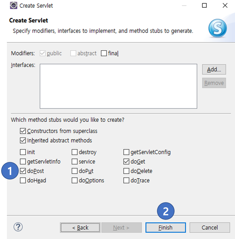 우선 doPost는 체크를 풀고(1) [ Finish ] 클릭(2)