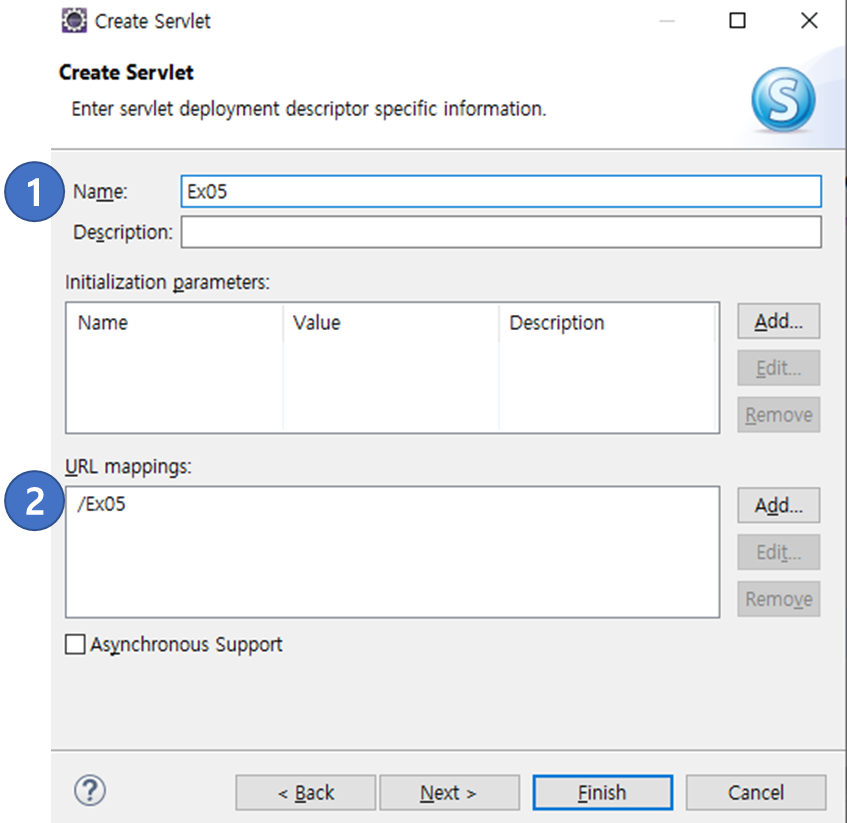 | (1) Name : web.xml에 servlet 태그를 사용해서 프로젝트에 서블릿을 등록할 때 지정한 서블릿의 별명 (2) URL mapping : web.xml에 servlet-mapping 태그를 사용해서 등록한 서블릿의 접근 경로를 지정한 것 이렇게 web.xml에 입력해야할 것들을 이 단계에서 처리한 것 |