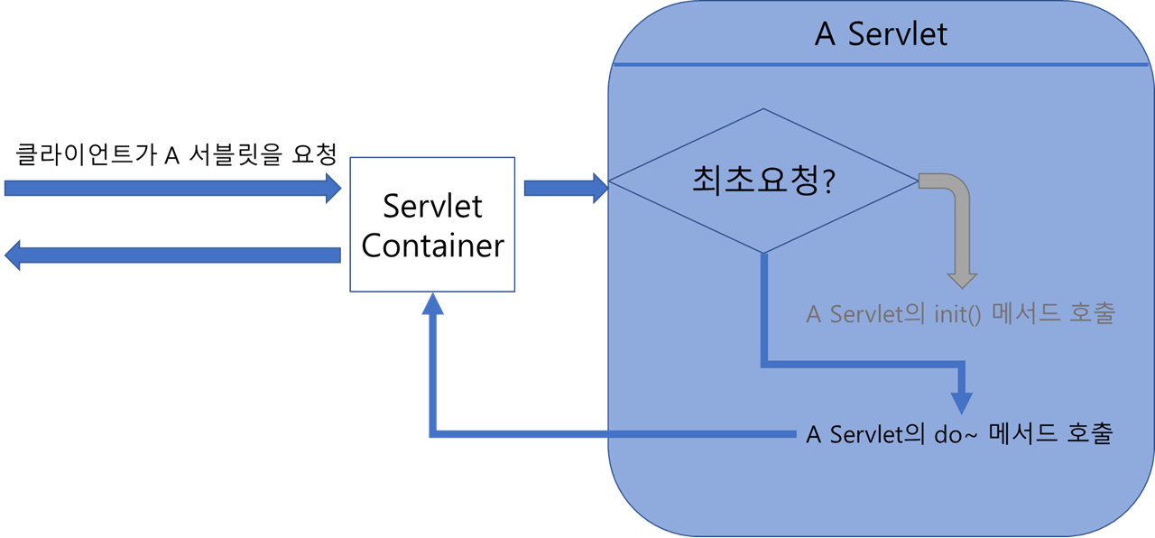 Servlet Container는 A 서블릿이 실행되고 난 후 클라이언트가 A 서블릿을 최초로 요청했다면 Servlet Container는 A 서블릿의 init() 메서드를 먼저 호출하고 그 다음 do~ 메서드를 호출함 그리고 난 다음! do~ 메서드가 반환한 처리 결과를 웹서버에게 전달함