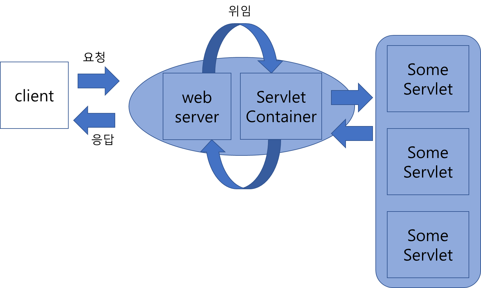 그리고 해당 서블릿이 반환한 처리 결과를 웹서버에게 전달하고 웹서버는 Servlet Container에게 전달 받은 처리 결과를 클라이언트에게 전달(응답, Response) 함