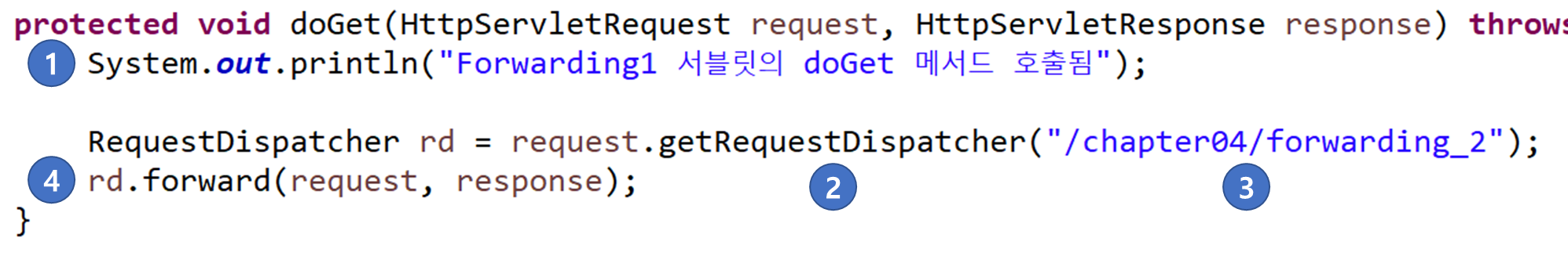꺼낸 RequestDispatcher 객체의 forward 메서드를 사용해서 포워딩을 하고 있음(4)