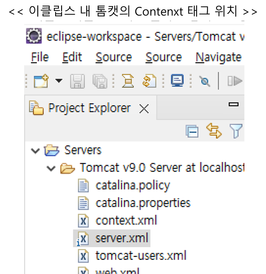 이클립스에 있는 톰캣의 경우에는 이클립스 왼쪽에 [ Explorer 창 ] -> [ Servers ] -> [ Tomcat ~ ] -> [ server.xml ] 파일을 보면 마찬가지로 Context 태그로 등록 되어있음