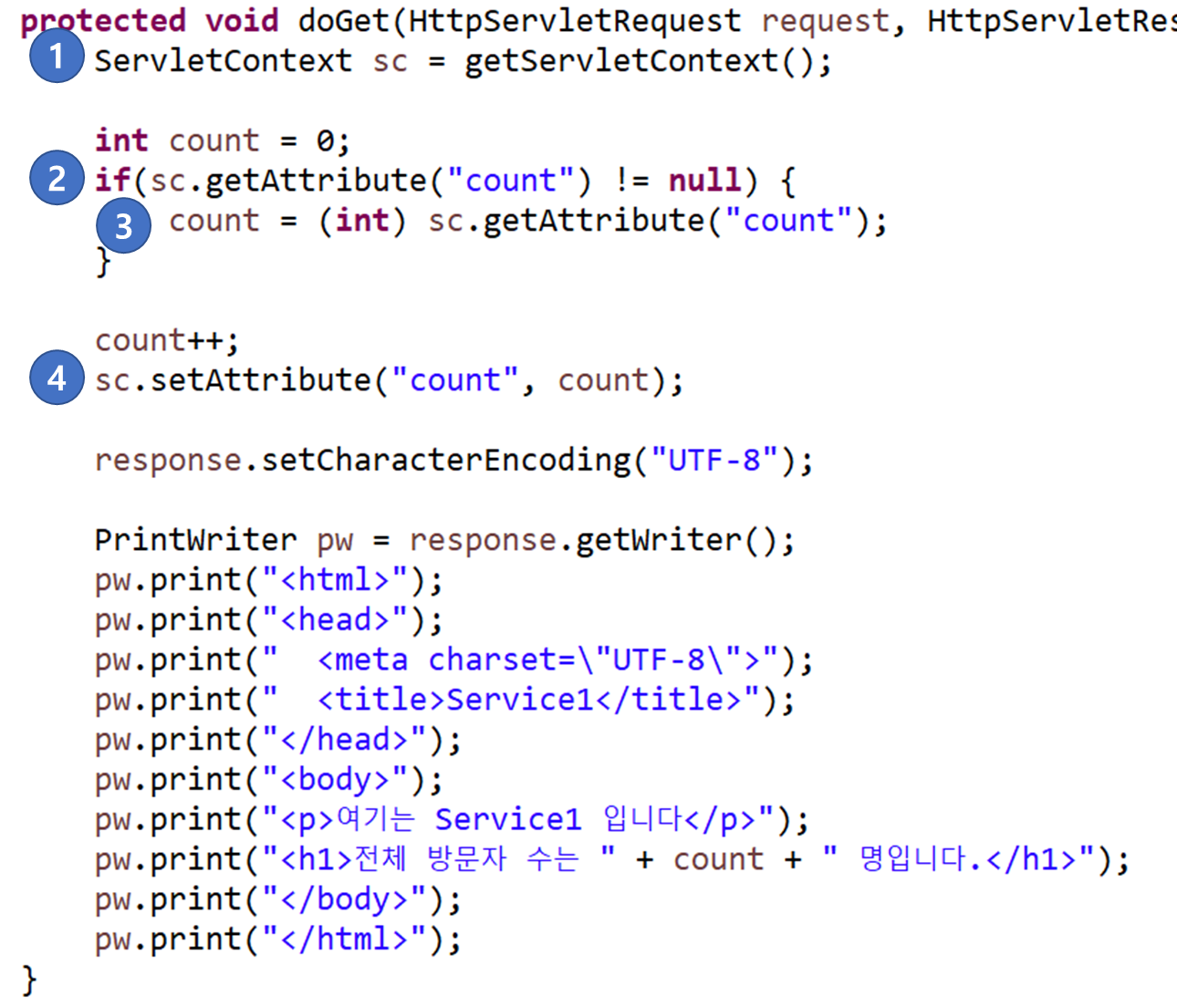 서블릿 컨텍스트 안에 이름이 count 인 속성(attribute)의 값이 있다면(2) 그 값을 꺼내서 원래의 형태로 형변환 후 count 변수에 저장함(3)