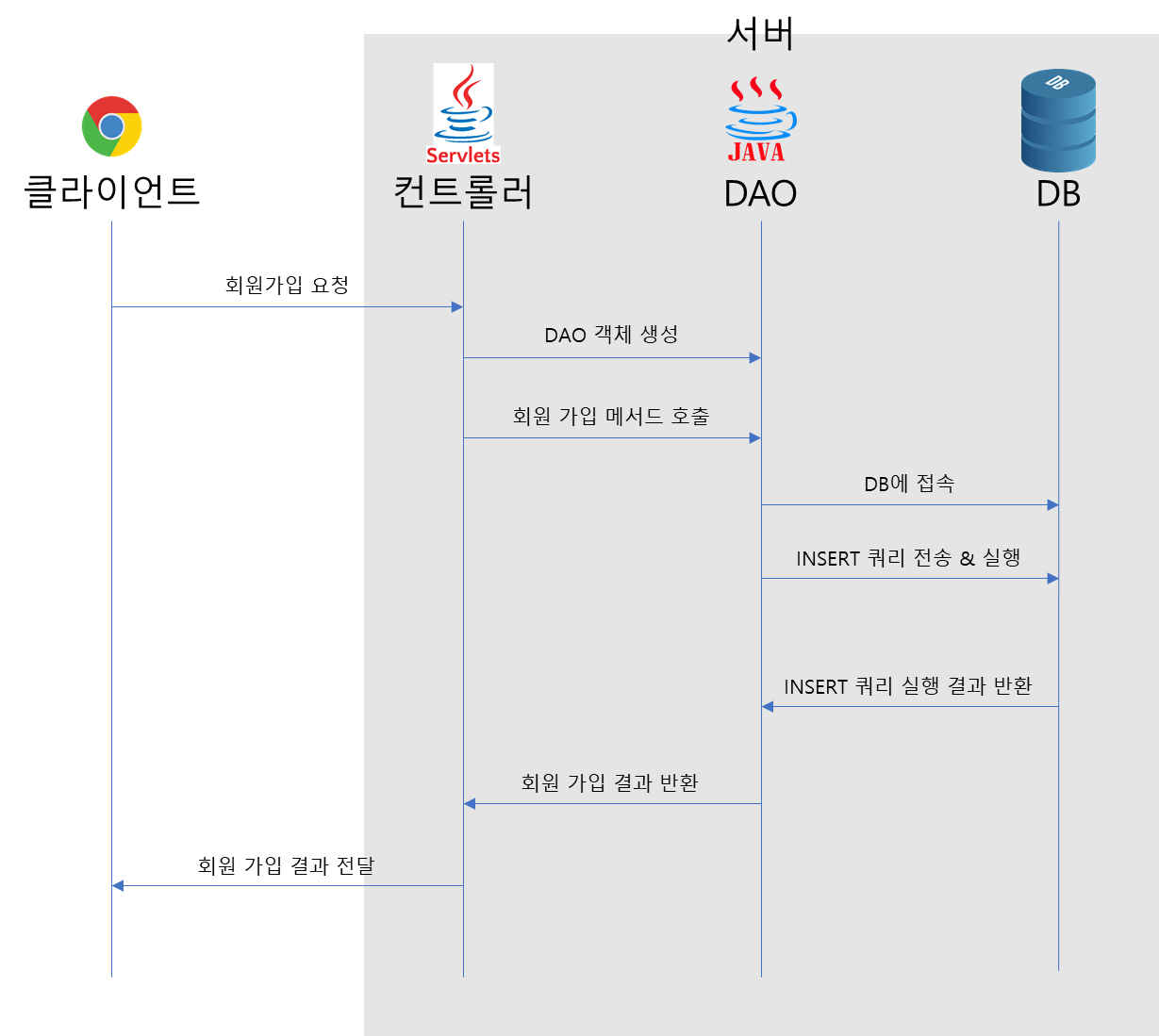 사용자가 회원 가입 페이지에서 회원 가입 하는 상황을 전체적인 시스템의 흐름으로 알아보자