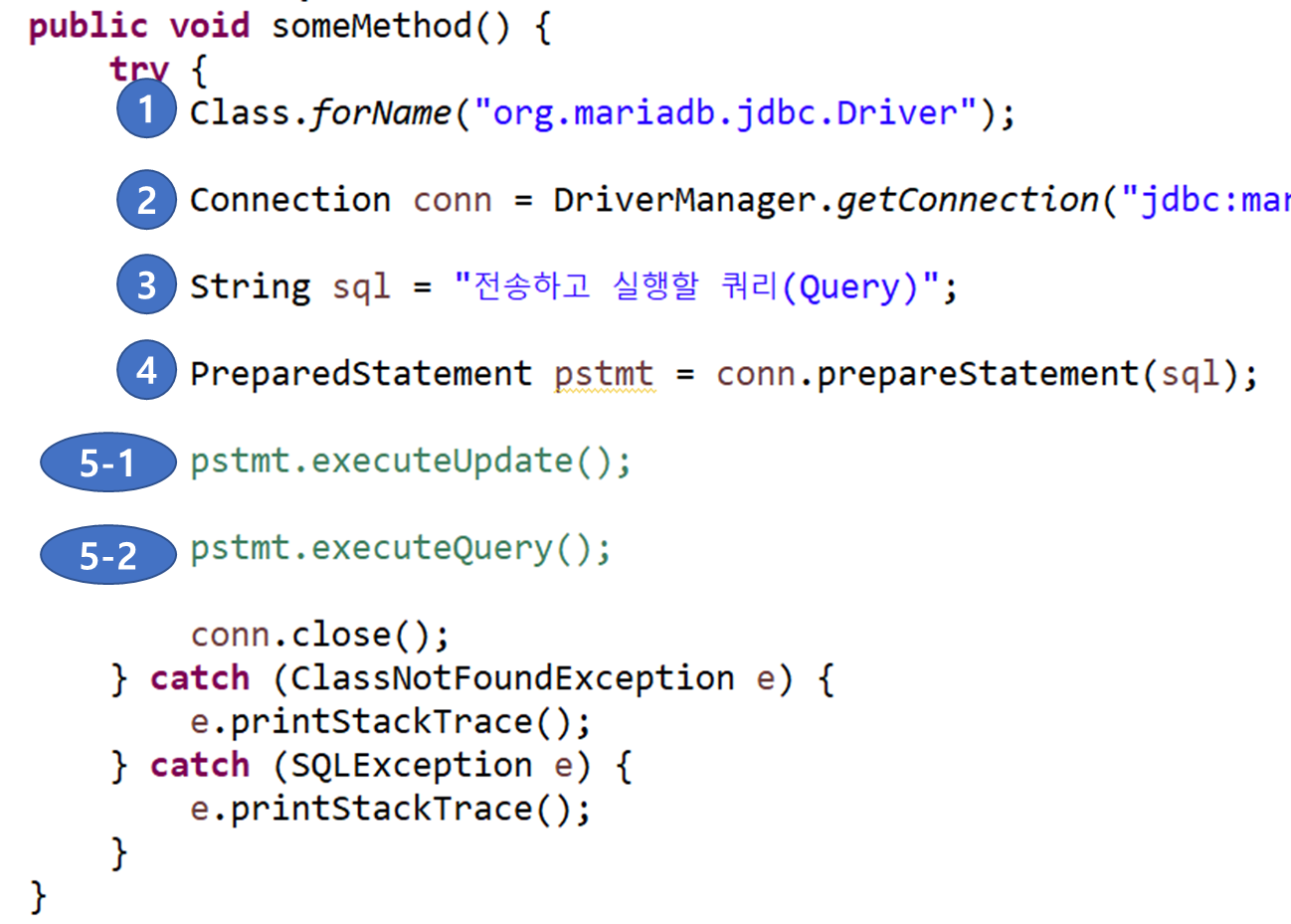 실행할 쿼리가 INSERT, UPDATE, DELETE 라면 executeUpdate 메서드를 호출(5-1)하고 실행할 쿼리가 SELECT 라면 executeQuery 메서드를 호출(5-2)해야함