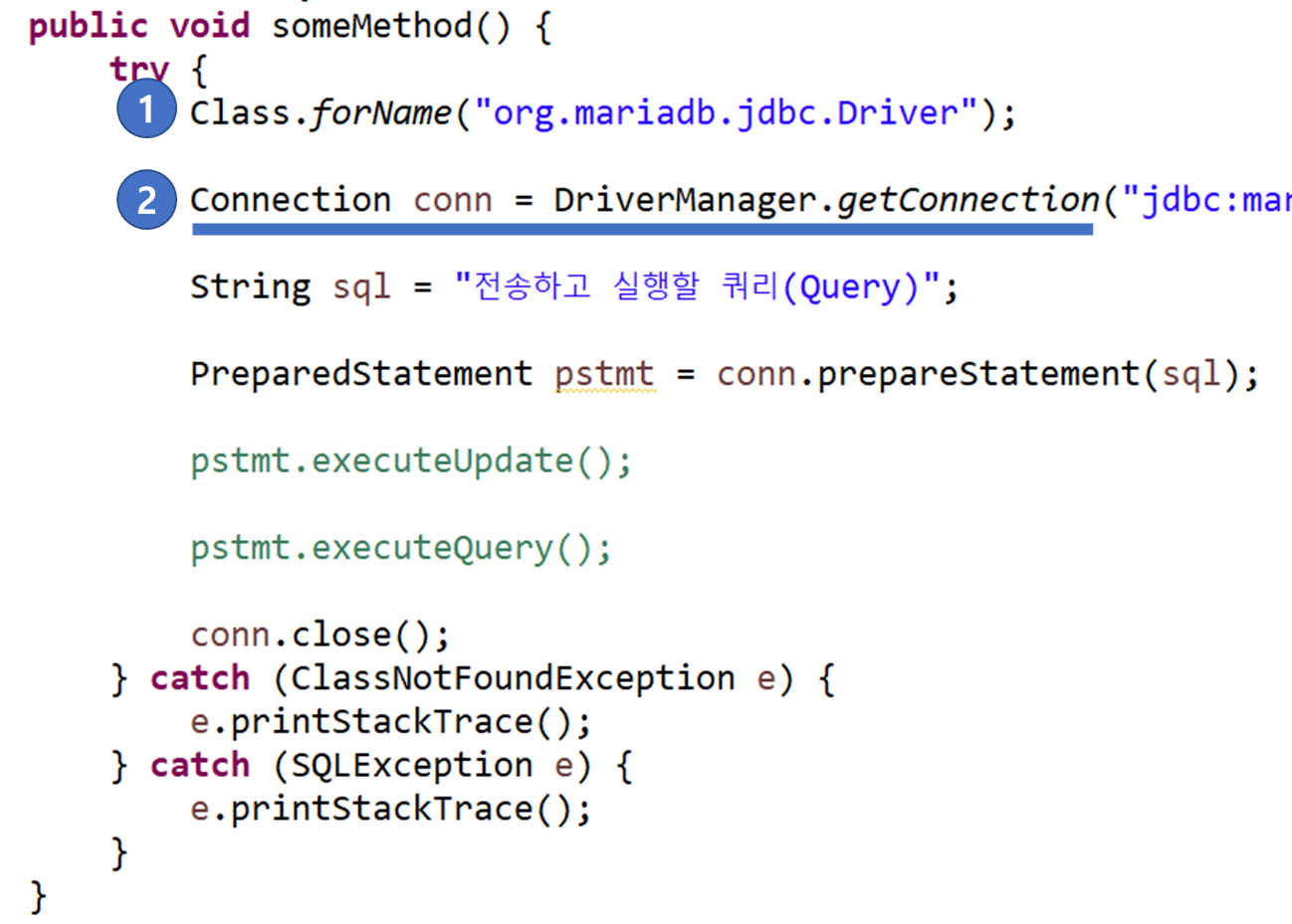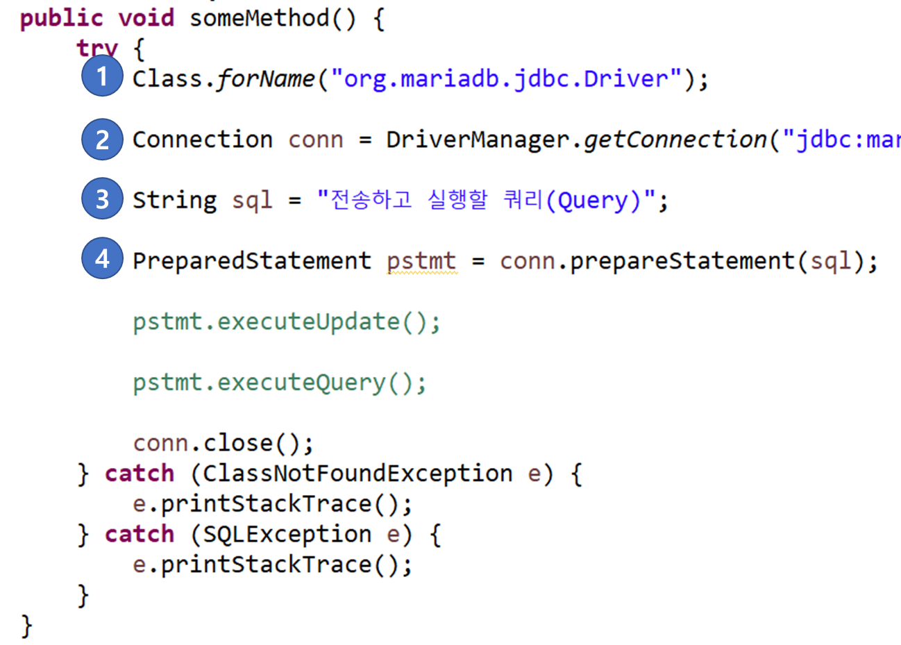 코드 가독성을 위해 실행시키고 싶은 쿼리를 먼저 작성(3) 한 후 Connection 객체 안에 들어있는 쿼리를 전송하고 실행시킬 PreparedStatement 객체를 꺼냄(4)
