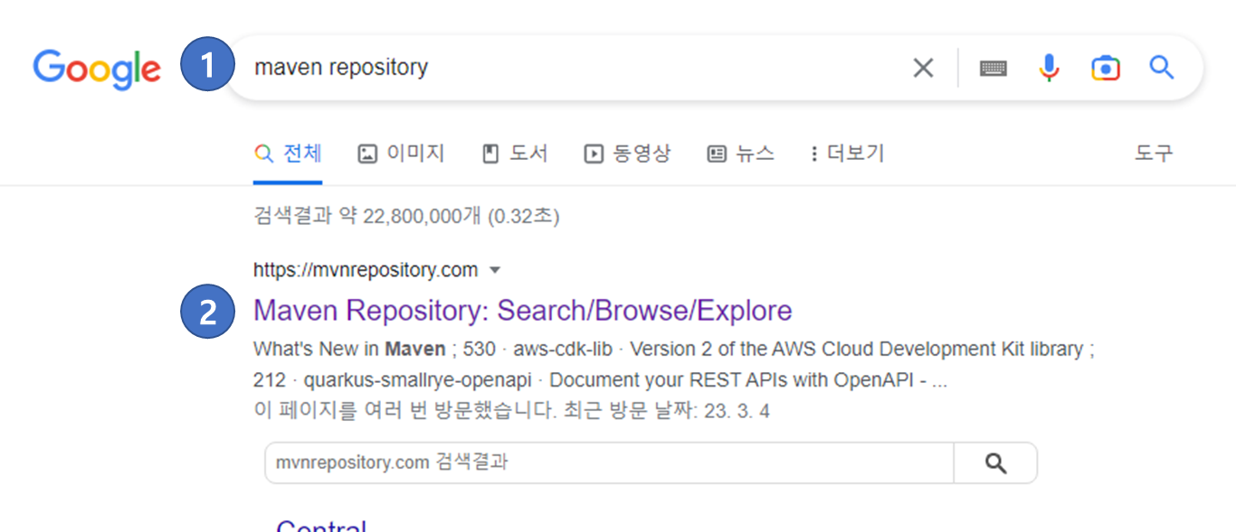 라이브러리를 다운 받기 위해 구글에 maven repository 로 검색하자(1)