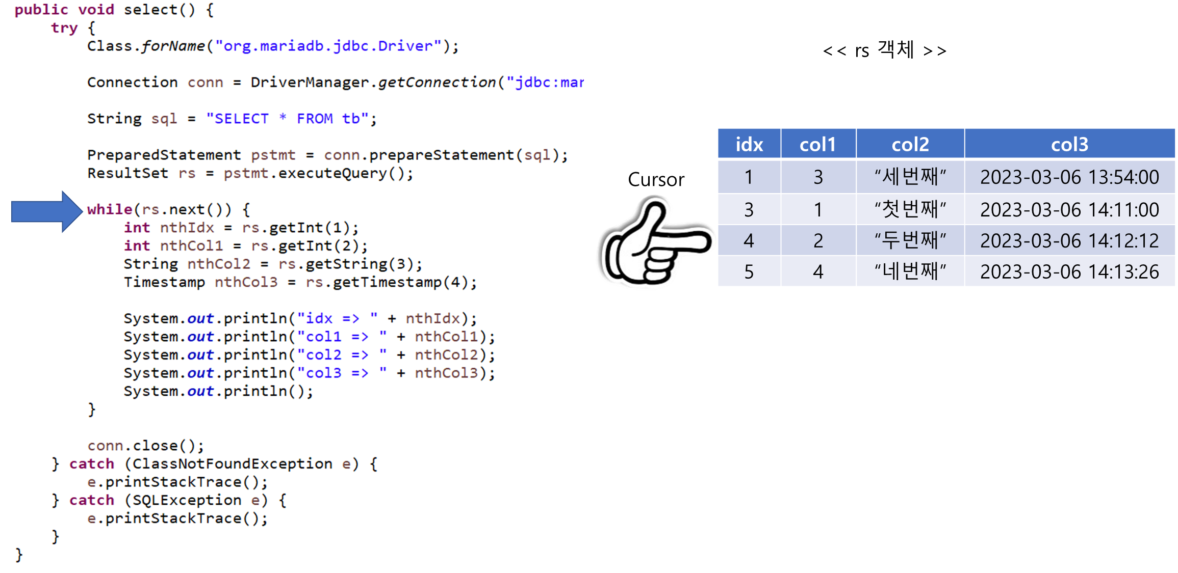 while문을 만나면 조건식의 rs.next 메서드가 동작해 커서가 한 칸 이동함