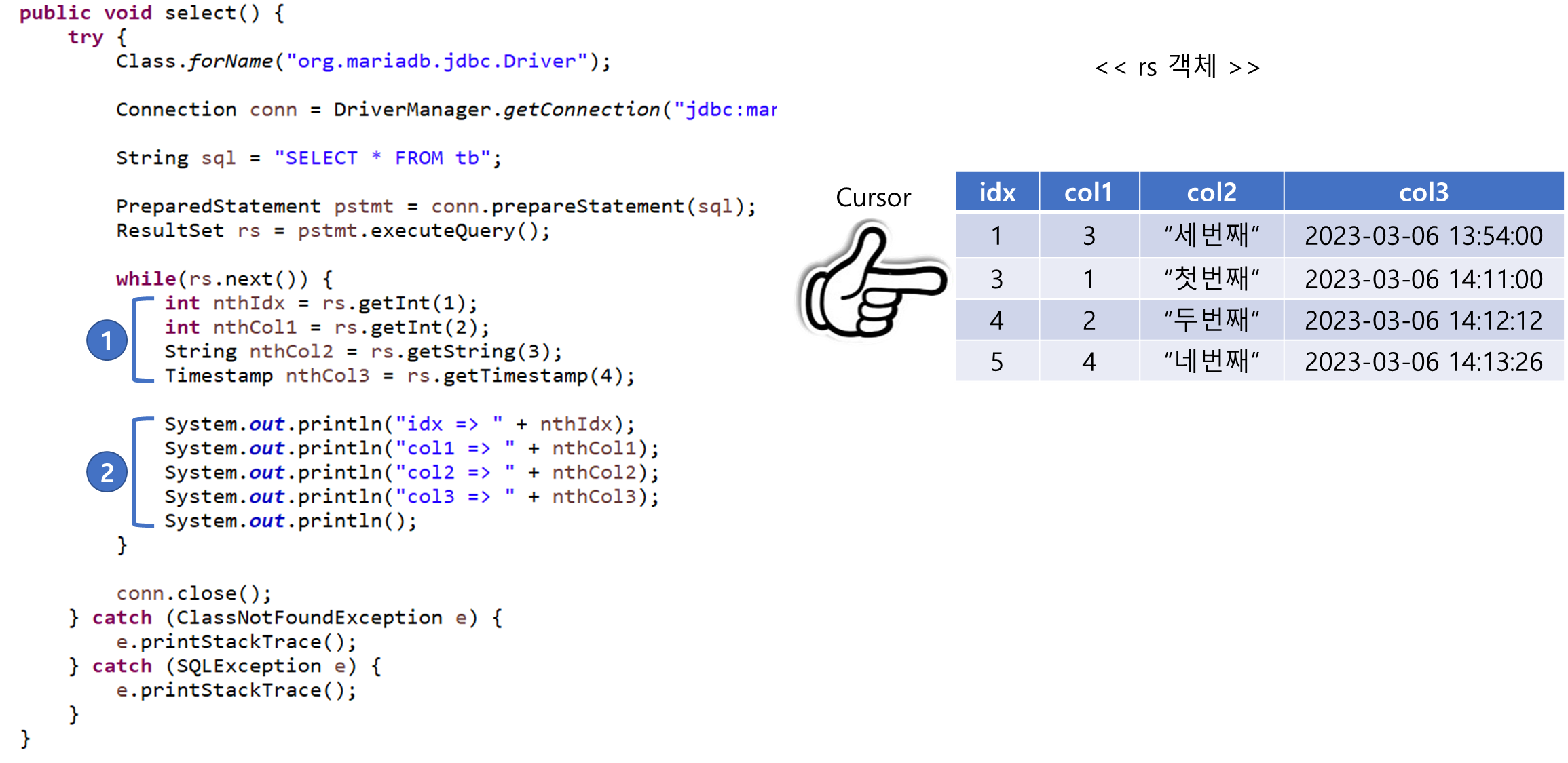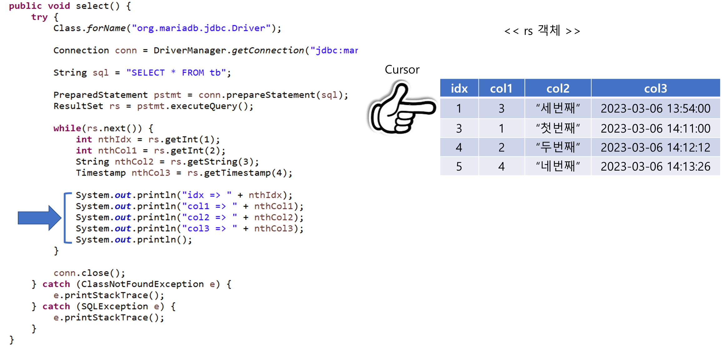 while의 조건식이 true이므로 while 안으로 들어가 현재 커서가 가리키는 두 번째 데이터의 idx, col1, col2, col3 칼럼의 값을 꺼내고(1) 출력함(2)