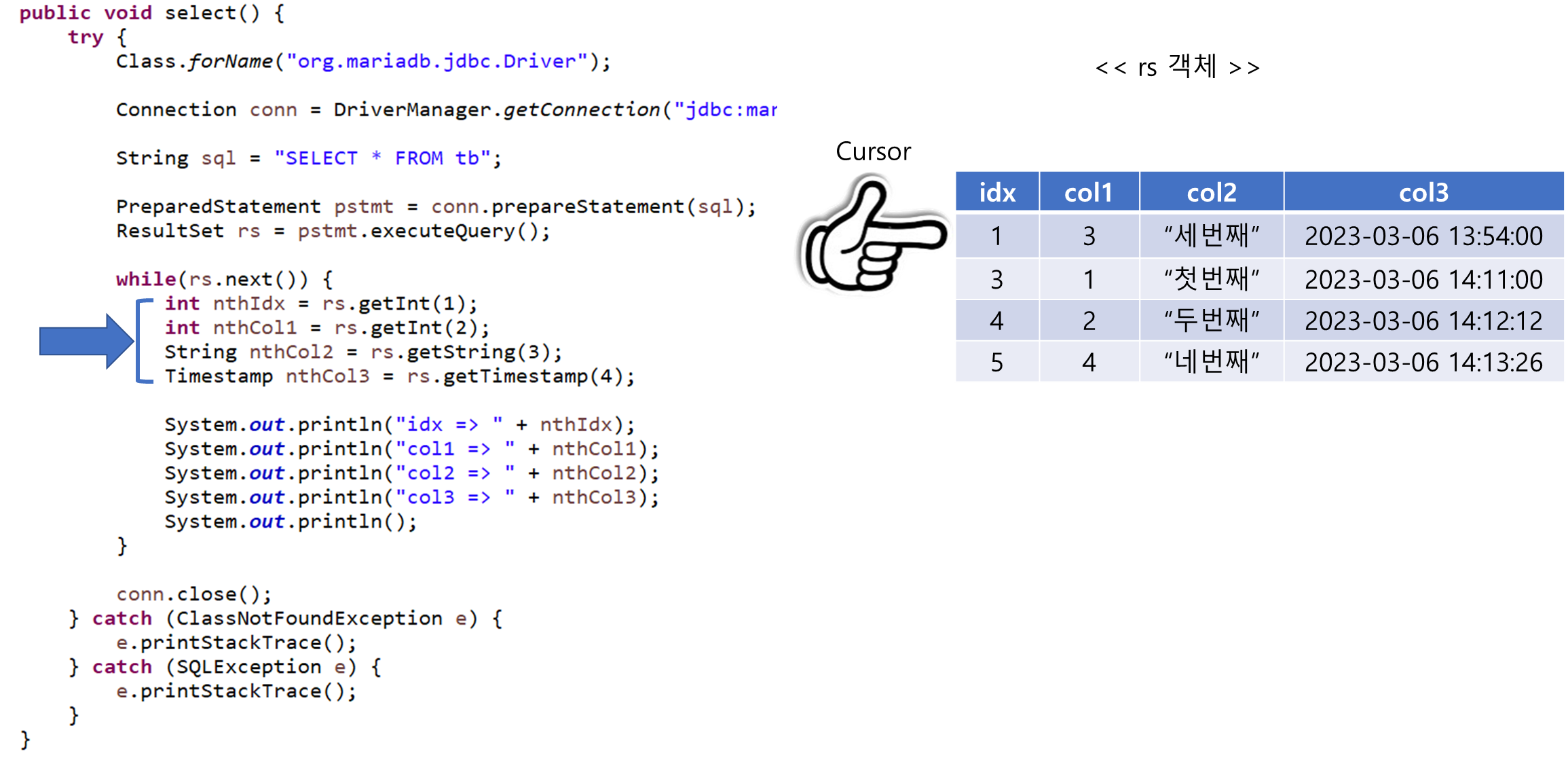 그리고 자바는 Cursor 위치의 데이터를 꺼낼 수 있음