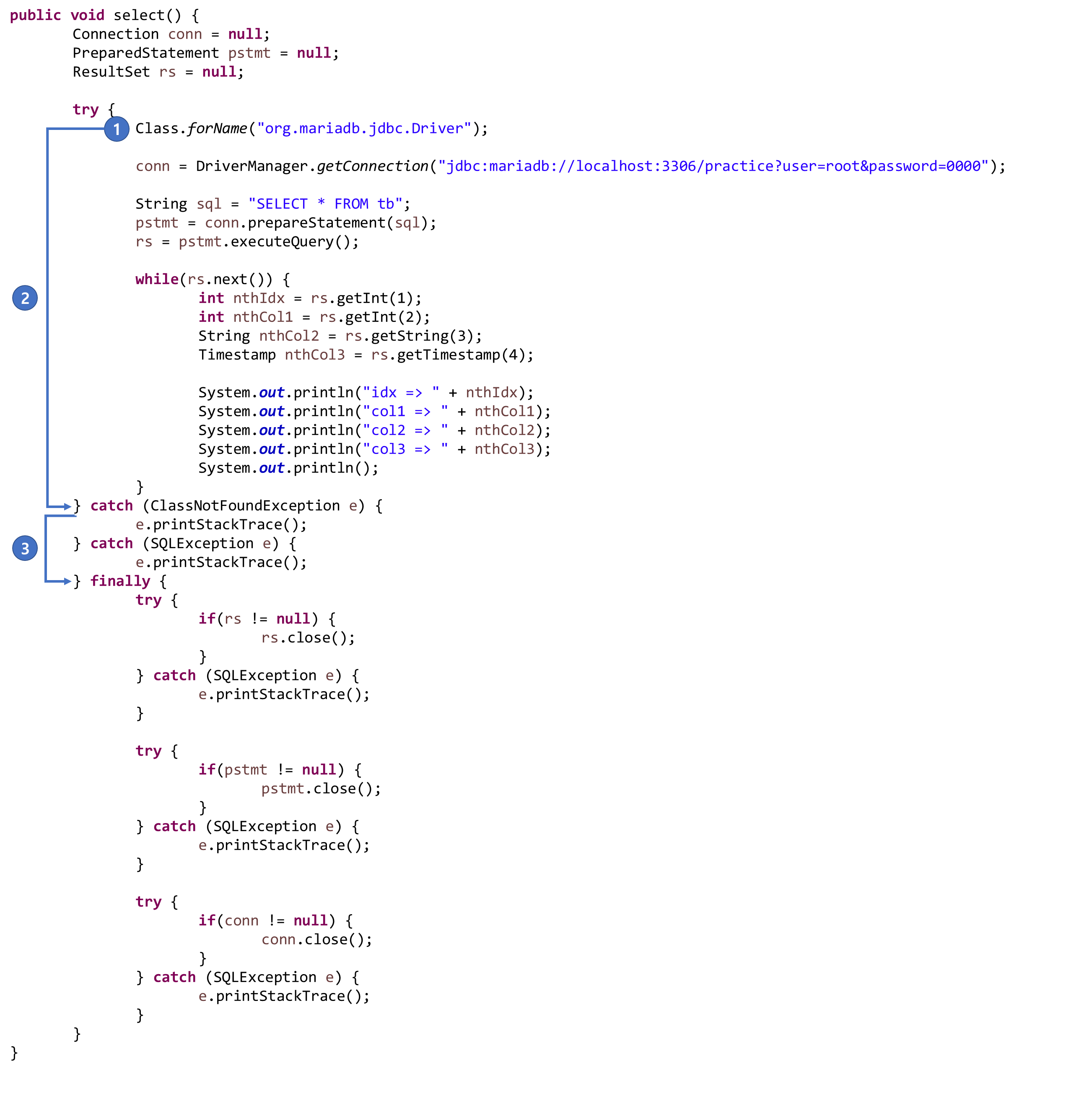 또한 PreparedStatement가 close 되지만 PreparedStatment의 close 메서드 동작 순서에 의해 먼저 ResultSet이 close 됨(3) 그 후 PreparedStatment가 close 되고(2) 마지막으로 Connection이 close 됨(1)