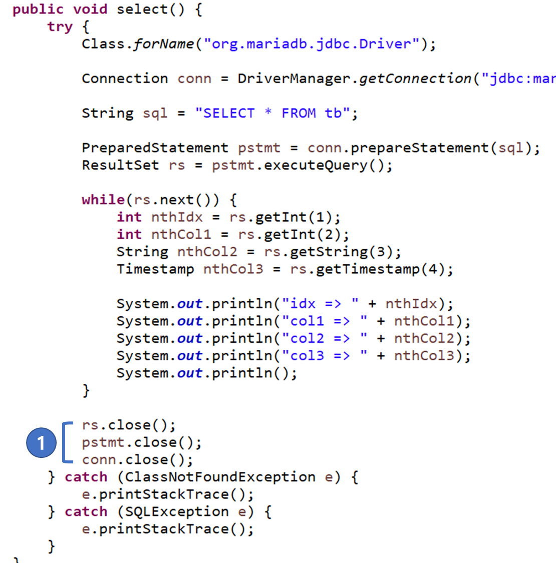 우리는 select 메서드의 마지막에 conn.close 메서드를 호출(1) 했지만 close 메서드의 내부에서는 PreparedStatment가 있으니 먼저 PreparedStatment 를 close 함(2)