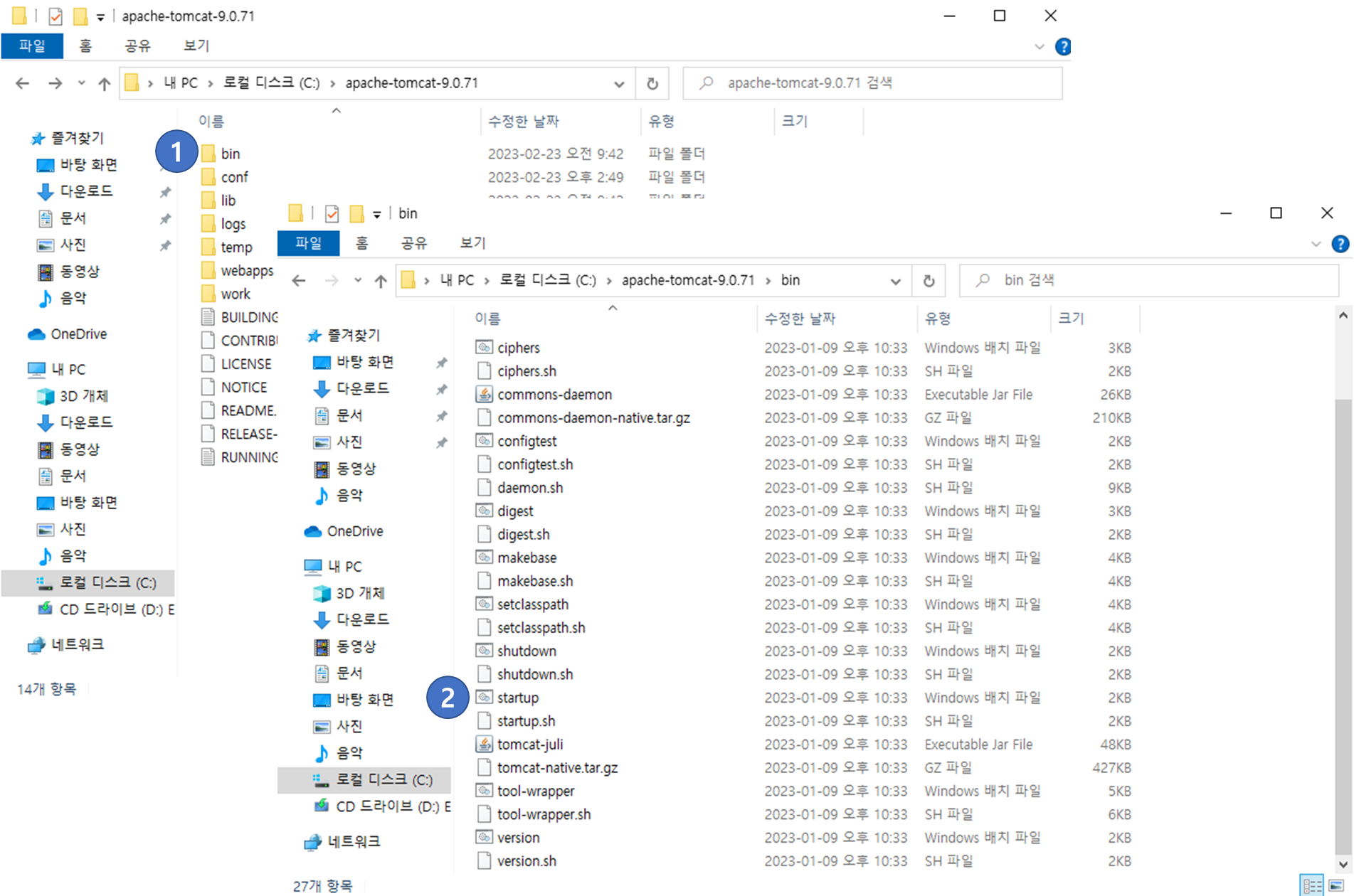 C 드라이브로 옮겨둔 서버 폴더로 들어가서 bin 폴더(1) 안에 있는 startup(2) 을 실행시키자