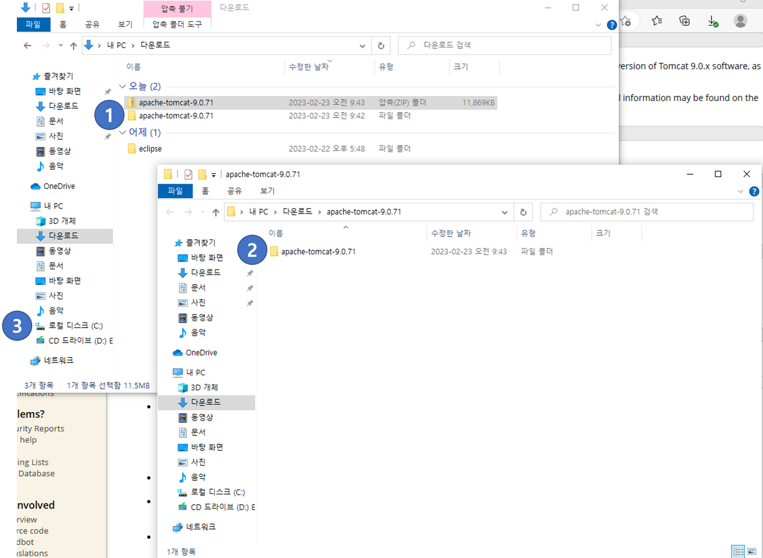 [ 내 PC ] 클릭(1) -> 로컬 디스크 (C:) 클릭(2) -> 톰캣 폴더 클릭(3) -> [ 확인 ] 버튼 클릭(4)
