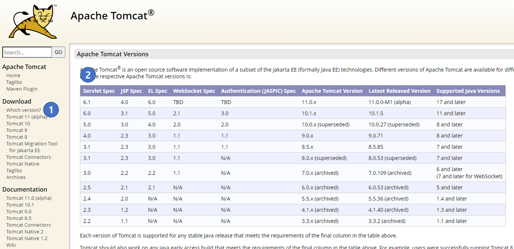 왼쪽 메뉴 중 [ Download ] 항목의 Which version? 을 눌러보면 내 상황에 맞는 톰캣 버전을 선택할 수 있도록 나와있음