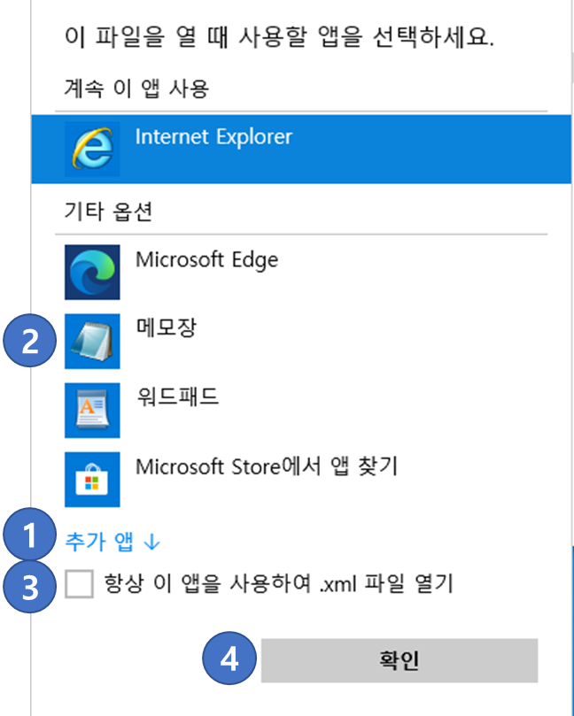 그 후 [ 추가 앱 ] 클릭(1) -> 메모장 클릭(2) -> [ 항상 이 앱을 사용하여 .xml 파일 열기 ] 클릭(3) -> [ 확인 ] 클릭(4)