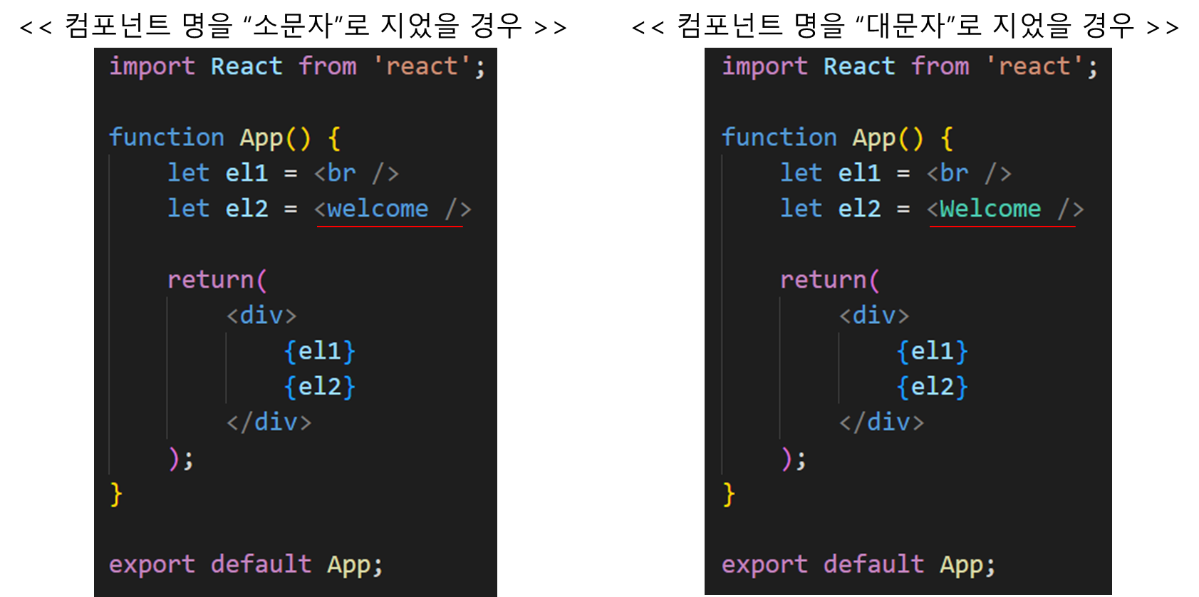 이렇게 컴포넌트명이 소문자로 시작하면 이 코드가 HTML 태그를 나타내는 코드인지 컴포넌트를 호출하는 코드인지 구분할 수 없게 됨