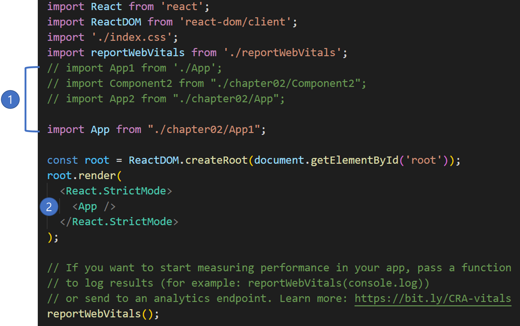 App1.js 파일에서 컴포넌트를 호출 할 때 권장하지 않는 방식(1)과 권장하는 방식(2)을 혼합해서 사용했음