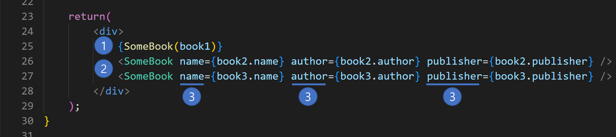 <SomeBook name={book3.name} author={book3.author} publisher={book3.publisher} />