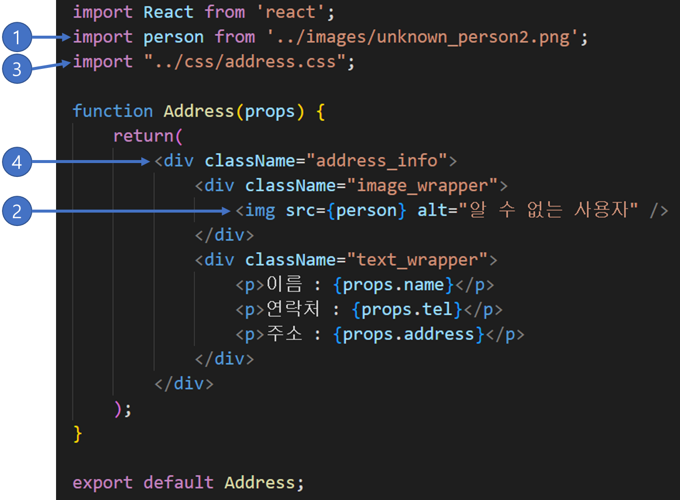 Address 컴포넌트는 props 로 전달 받은 이름, 연락처, 주소를 출력하고 있음