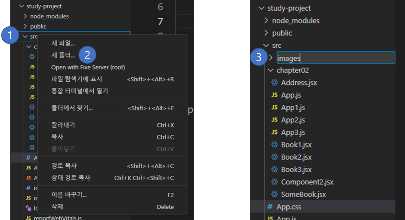 프로젝트 -> src 우클릭(1) -> 새 폴더(2) -> 폴더 이름을 images로 입력 후 엔터(3)