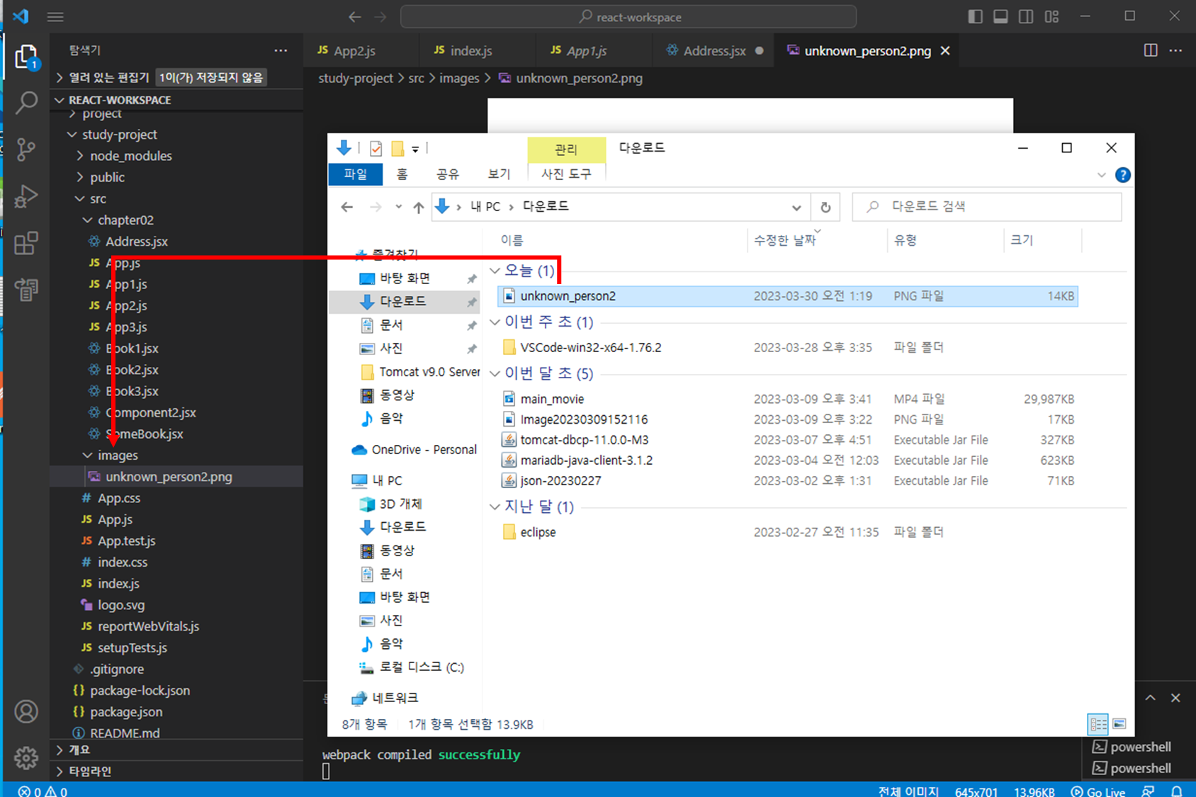 다운로드 받은 파일을 images 폴더로 넣을 때는 파일 탐색기에서 다운로드 폴더로 이동 후 옮길 파일을 드래그 해 images 폴더에 놓으면 됨