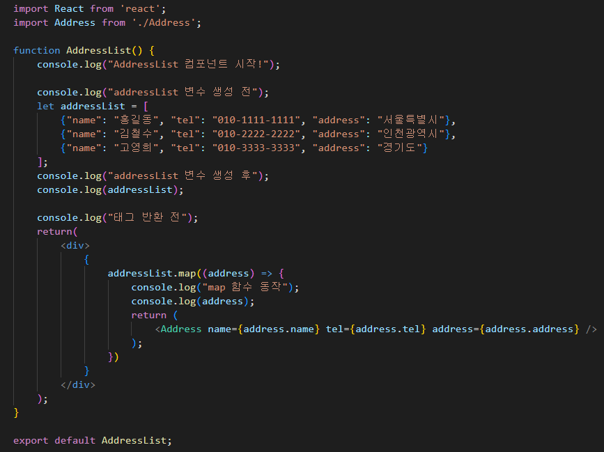 Chapter02에서 마지막에 실습했던 주소록 컴포넌트에 분기점을 출력하는 코드를 넣어보자