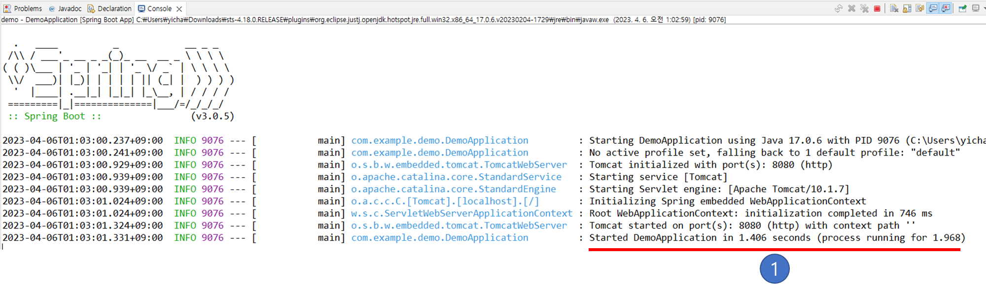 Spring Boot 프로젝트를 실행시켰다면 [ Console 패널 ] (1) 에 다음과 같이 서버가 실행됬다는 메세지(2) 가 나옴
