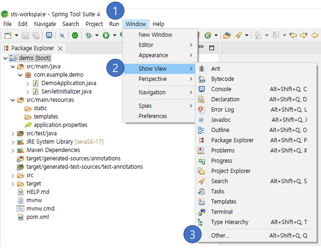 sts 상단 [ Windows ] (1) -> [ Show View ] (2) -> [ Other ] (3)